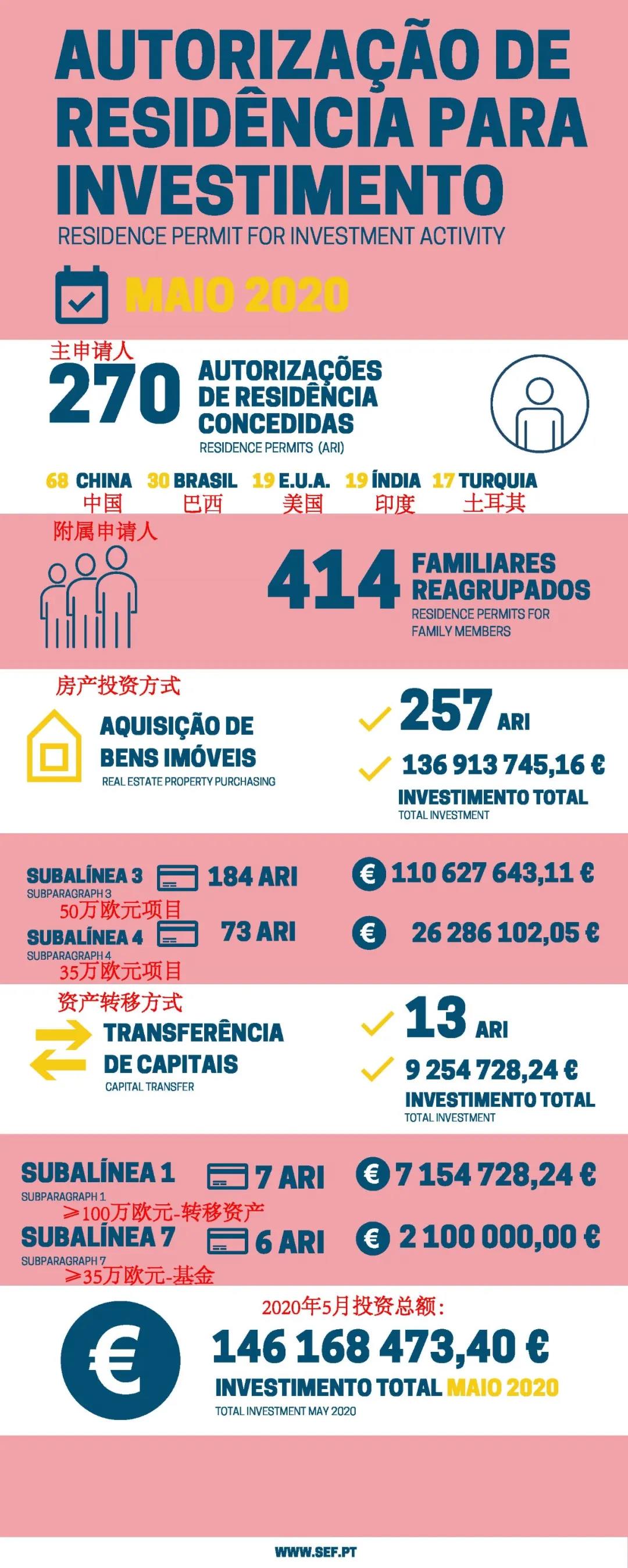 自2012年10月8日頒布新法至2020年5月31日,葡萄牙黃金居留許可項(xiàng)目共發(fā)放了23672張黃金居留卡,總投資額達(dá)到52.8億歐元!本月的獲批申請帶來了1.47億歐元的投資。