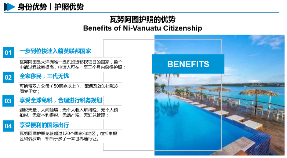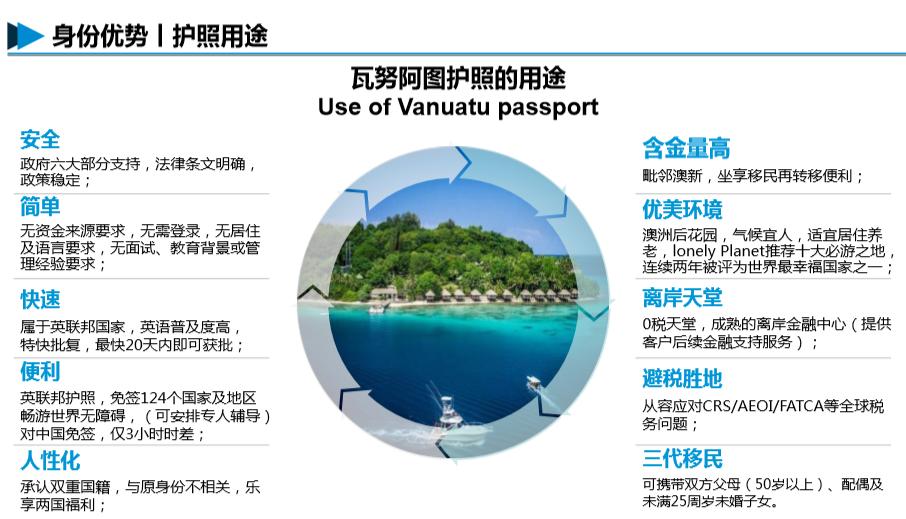 瓦努阿圖榮譽(yù)公民是南太平洋大洋洲唯一一個(gè)護(hù)照項(xiàng)目, 是目前市面上最快的護(hù)照項(xiàng)目, 最快僅需20天! 也是極少的可以免簽俄羅斯的國家之一, 這對與俄羅斯有緊密聯(lián)系的申請人有重要作用。